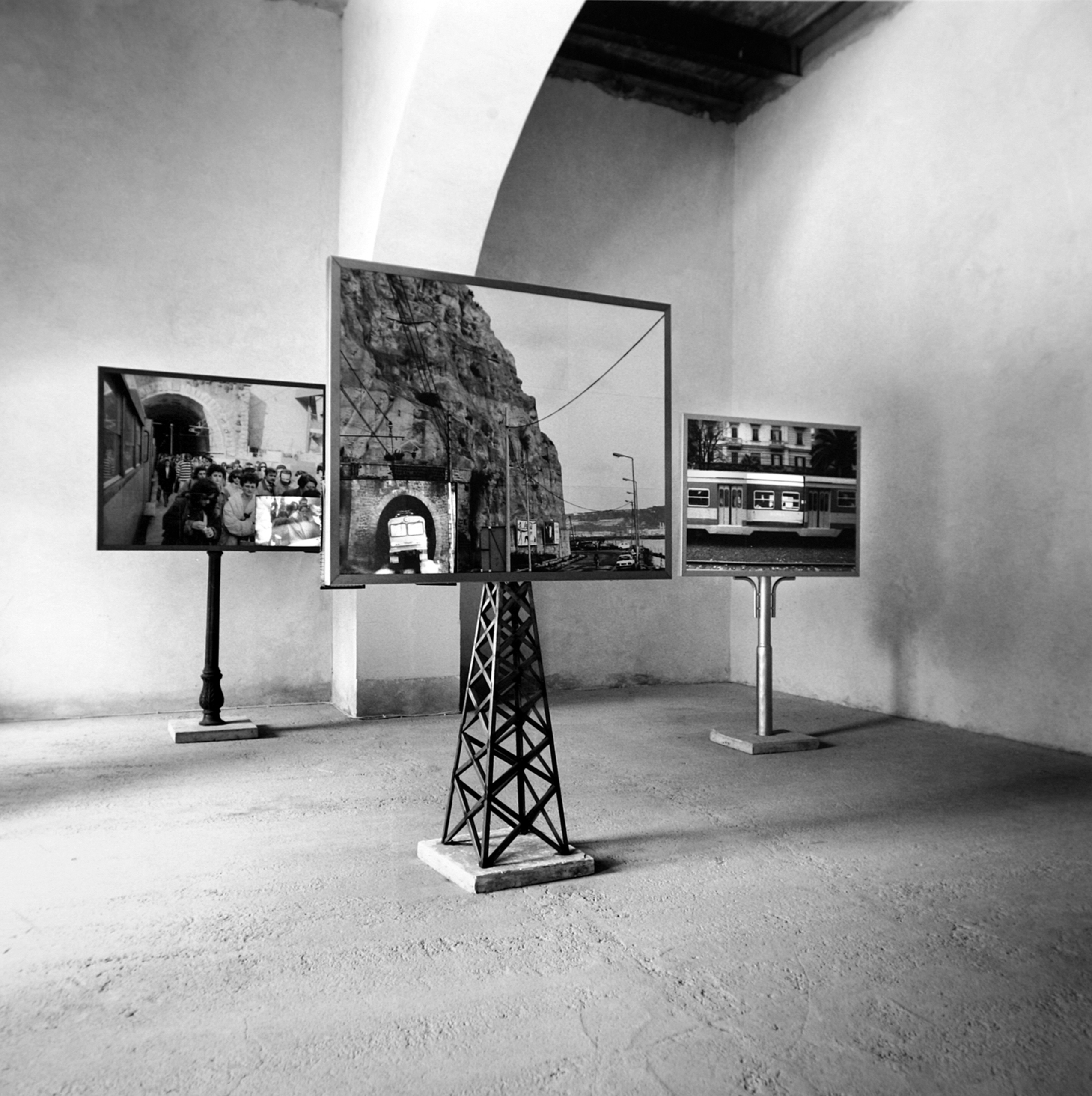 Le tre fotografie dell’installazione rappresentano tre stazioni urbane del treno della ferrovia Cumana, un percorso napoletano, da La pietra a Montesanto.